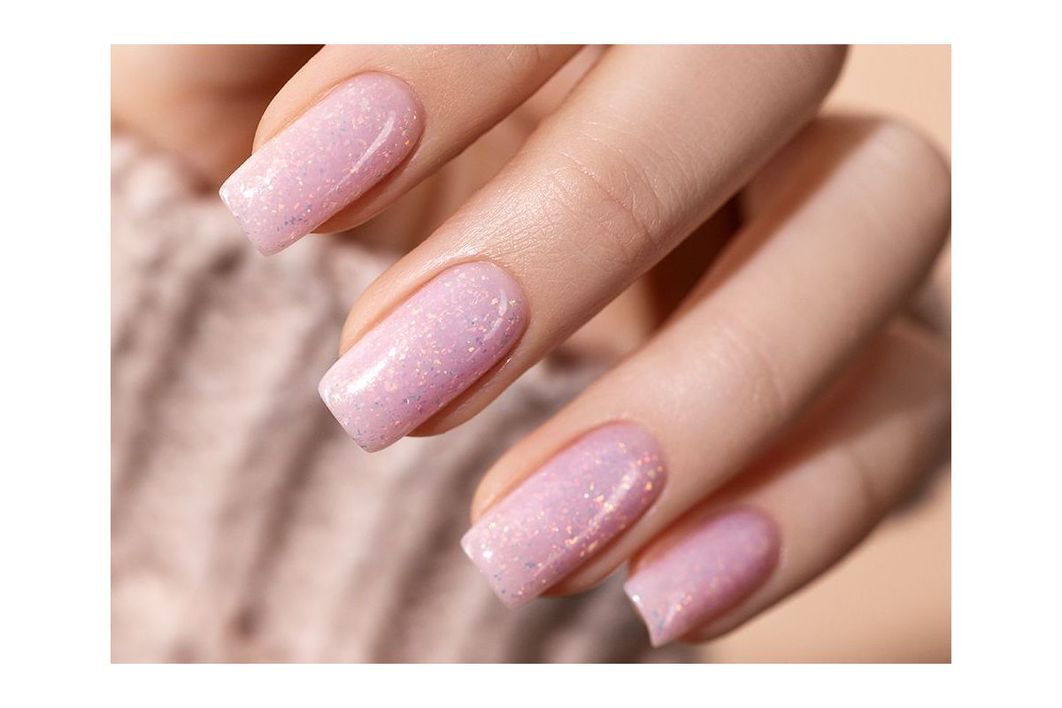 Subtle pink shimmering hybrid base with warm shades of gold foil.