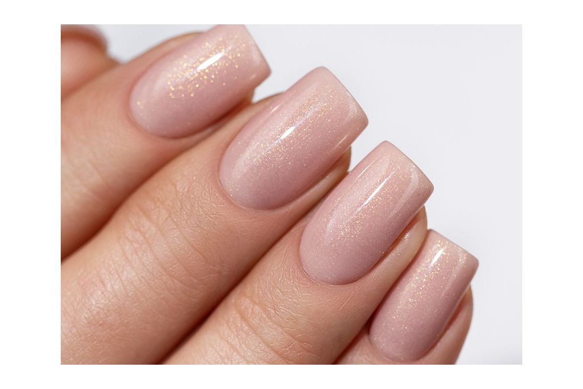 A subtle peach color with the addition of shiny gold with 80% coverage.
